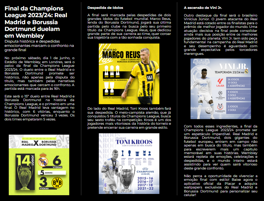 Conteúdo editorial desenvolvido para o app Placar Digital com foco na final da Champions League 2023/24, entre Real Madrid e Borussia Dortmund. O texto explora não apenas o confronto esportivo, mas também as narrativas que cercam a decisão, como despedidas de ídolos e o protagonismo de novas estrelas, criando uma leitura mais envolvente e contextualizada para o torcedor.