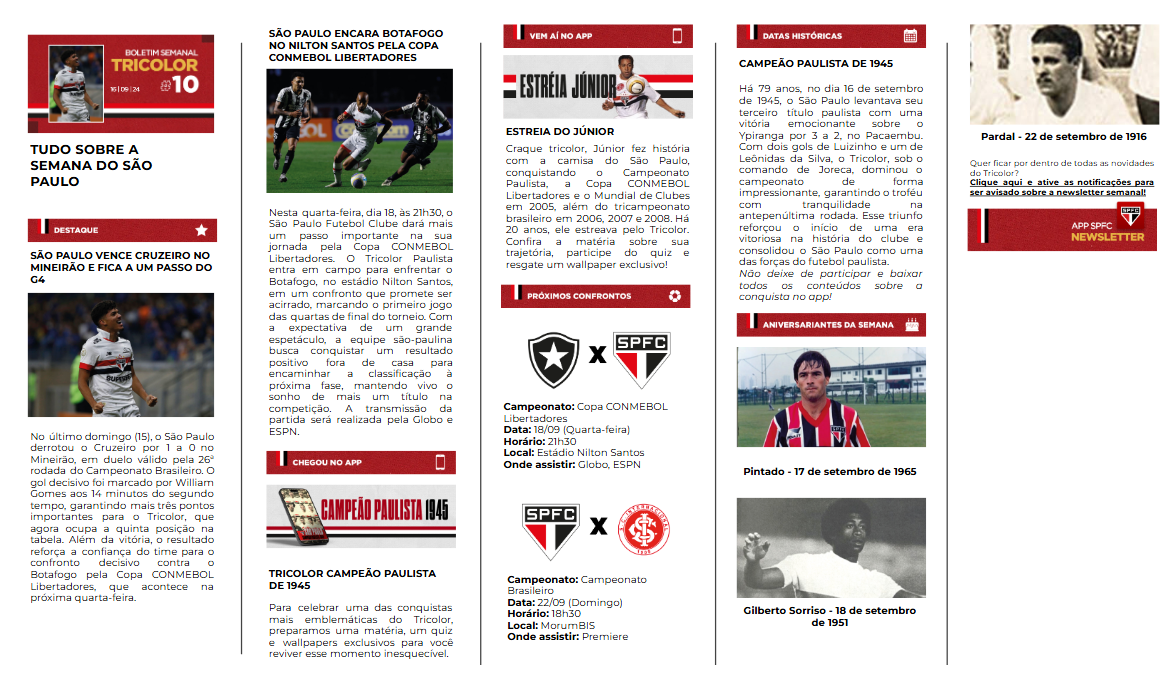 Desenvolvimento de conteúdo para a newsletter oficial do São Paulo FC, integrada ao aplicativo do clube. A proposta editorial combina informação e engajamento, reunindo notícias atualizadas, destaques da semana, cobertura de partidas e conteúdos históricos relevantes para o torcedor.