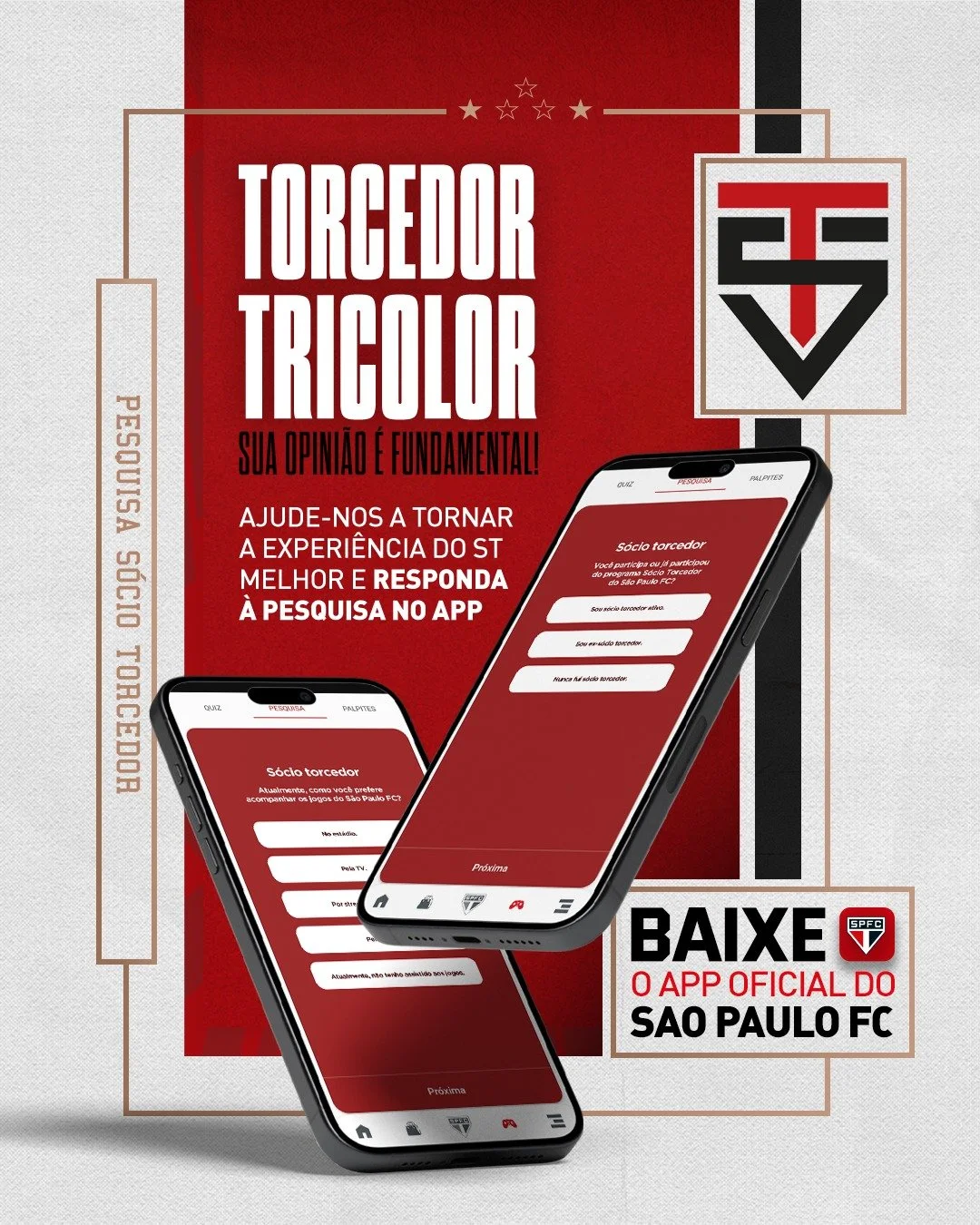 Peça desenvolvida para incentivar a participação ativa da torcida do São Paulo FC por meio de pesquisas dentro do aplicativo oficial do clube. A comunicação explora o senso de pertencimento e dá protagonismo ao torcedor, reforçando a ideia de que sua opinião tem impacto direto na construção da experiência digital.